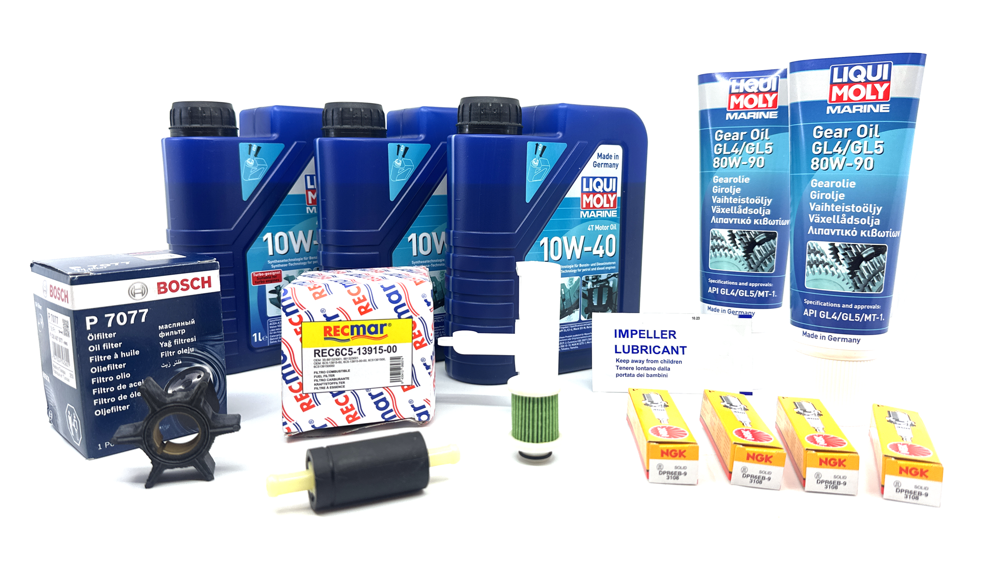Nye filtre sørger for ren bensin og olje, mens nye tennplugger gir enkel start og stabil gange. Impelleren holder kjølesystemet i gang slik at motoren ikke overopphetes.