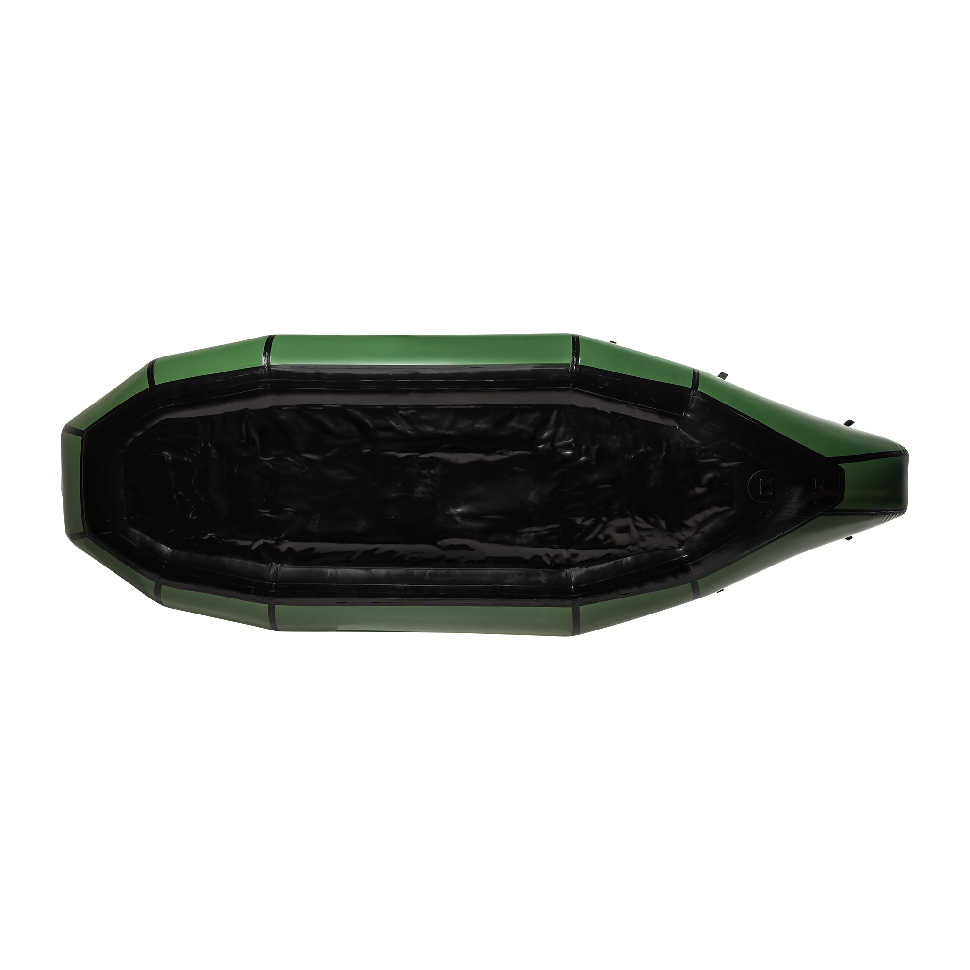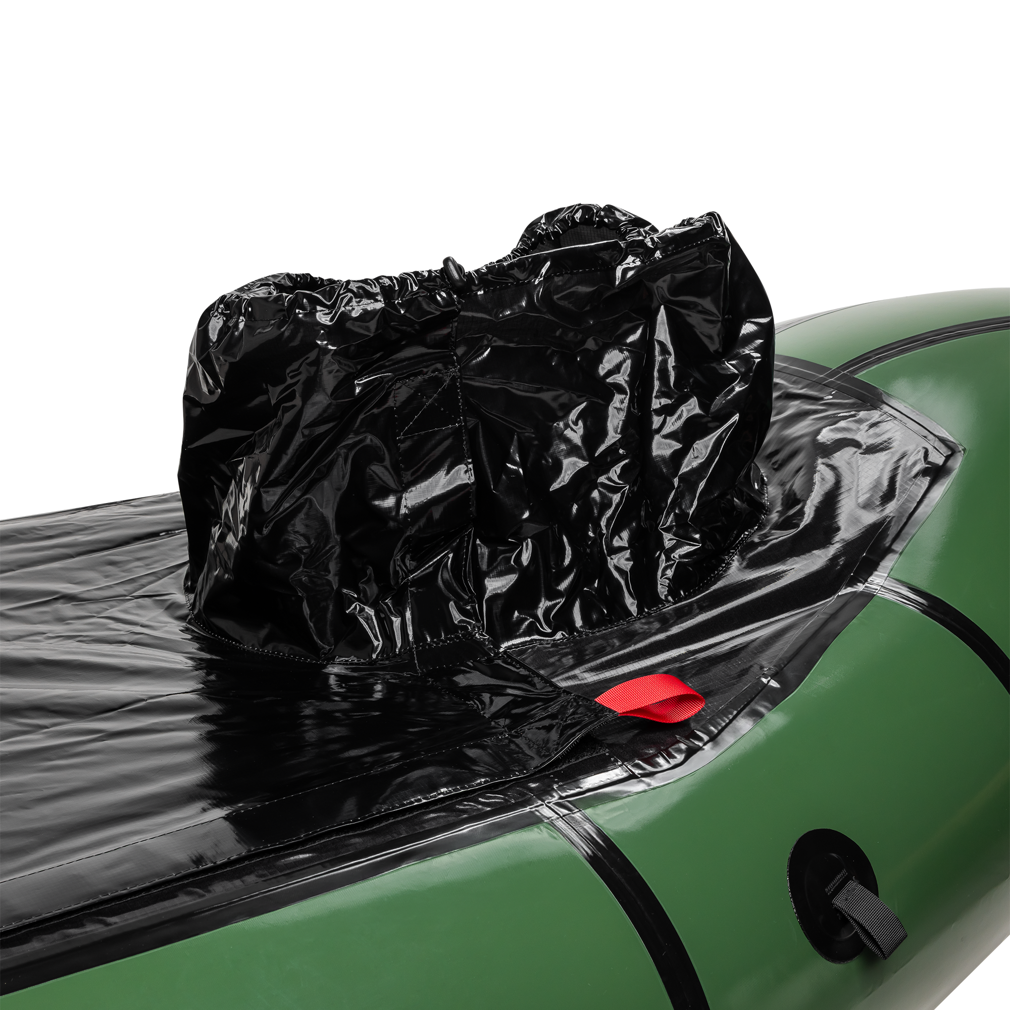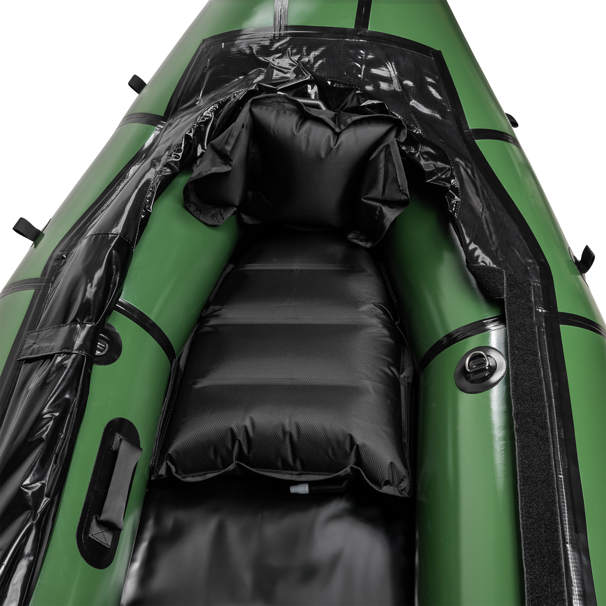 D-ringer: 2 stk. i stål, 8 stk. i nylon, 4 stk. i stål/nylon | Håndtak: 3 stk. | Finne: Ja, avtagbar | Finnefeste: Ja, montert på båten | Farge: Skogsgrønn | Spruttrekk: Ja, fastmontert og kan rulles til siden