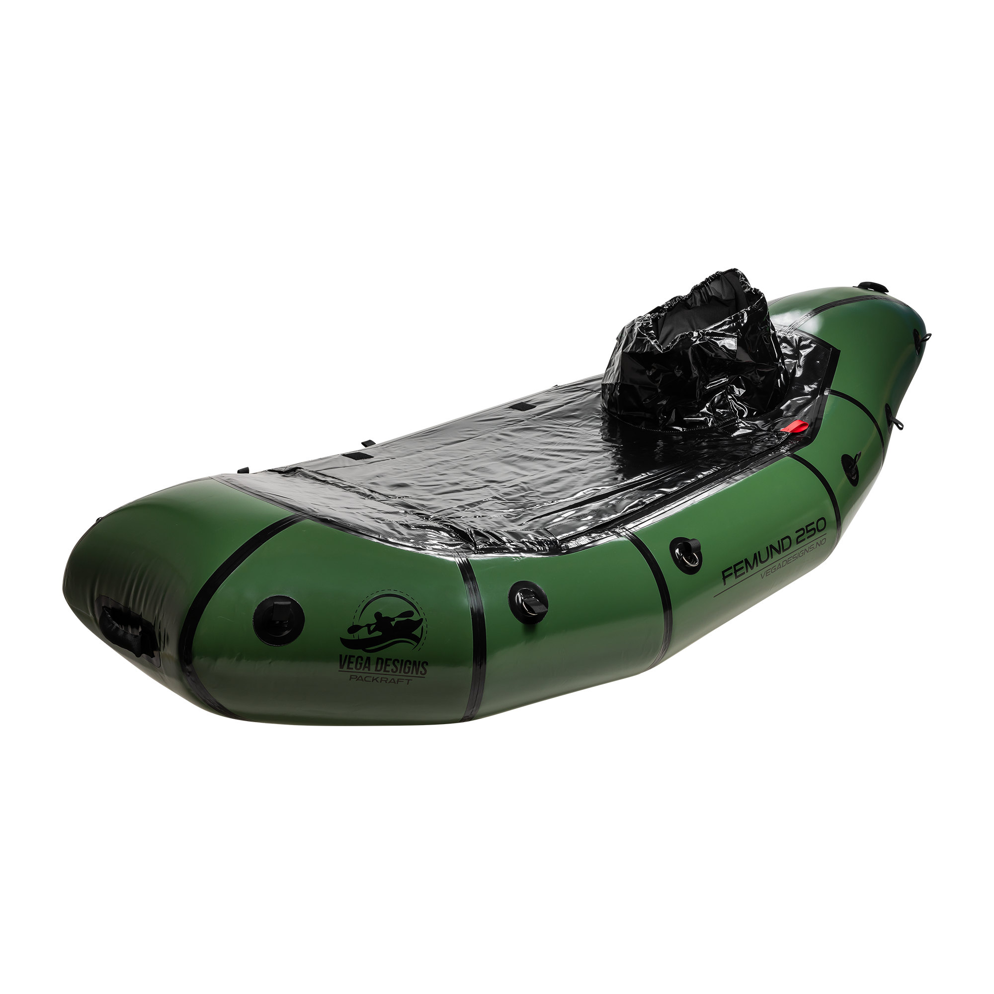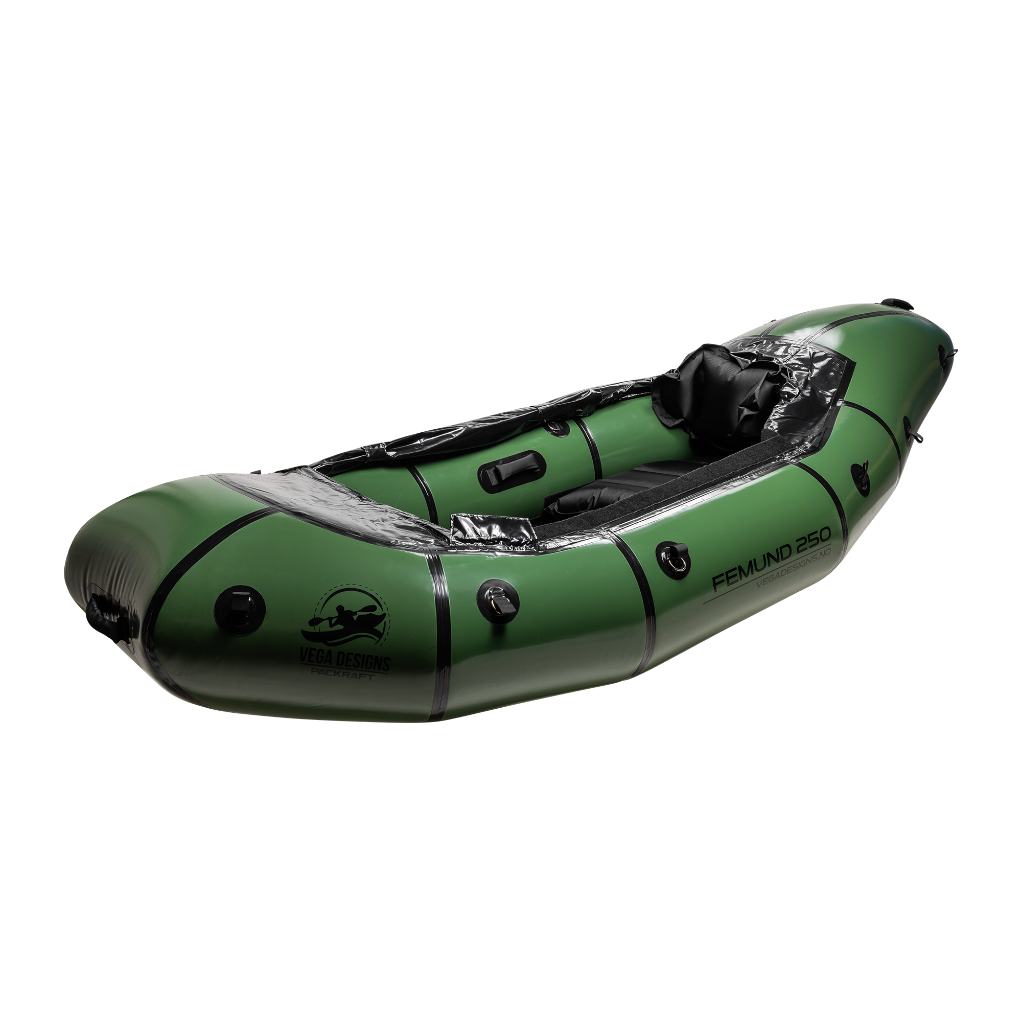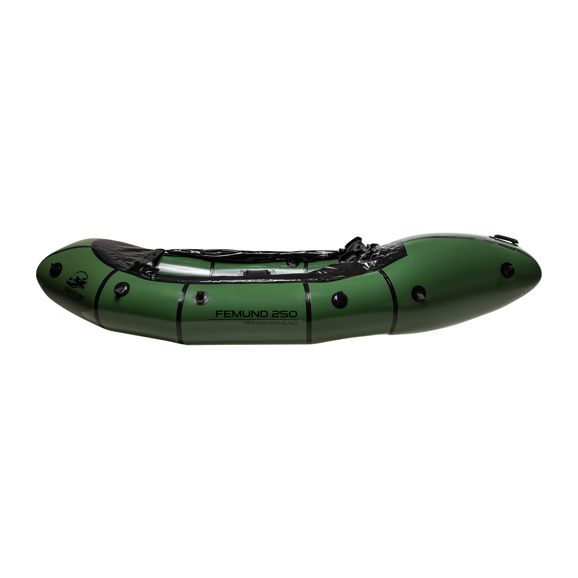 Vega Designs Femund 250 er en svært solid packraft laget for et aktivt friluftsliv. Dette er en robust og gjennomtenkt modell for deg som vil ha en packraft med god retningsstabilitet, høy lastekapasitet og trygge padleegenskaper i mange ulike typer farvann. Packraftens form, kombinert med styrefinnen, gir god kursstabilitet og et godt fartspotensial. Femund 250 er først og fremst utviklet for padling på flatt vann, men den oppfører seg også svært godt i rolige elver, på fjellvann og i norsk skjærgård.